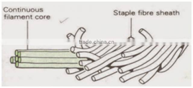 Poly Poly /Cotton Poly Core spun yarn , made by wrapping a staple polyester wrapper around a continuous filament bundle of polyester fibers during spinning, and then plying these yarns into a sewing thread. The continuous filament polyester core makes up approximately 65% of the thread construction.