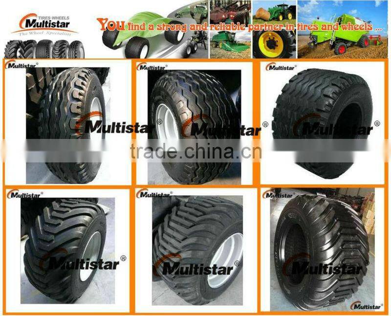 2.Tubeless flotation tire with good self cleaning characteristics, suitable for agricultural implements, and particular, for towed vehicles. High load capacity at low inflation pressures prevent damage to fields and crops.