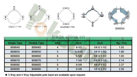 | Feature: | Yokelink pole band used for dead ending , guying and mounting secondary racks on metal poles or wood poles. All components are Hot dip galvanized to meet ASTM A153 specification. |
