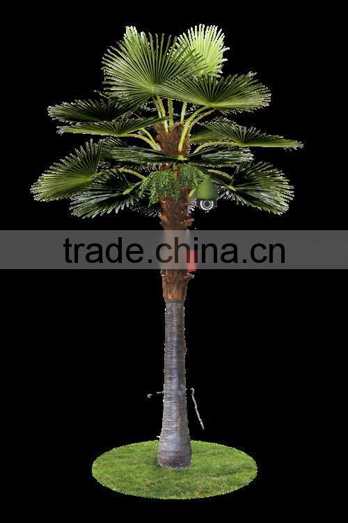 Inside it there are national standard thickening galvanized steel pipes with seamless connection which are used for reinforcement, rust prevention and anticorrosion. The cortex is composited by the original tropical tree bark, palm tree and glass fiber reinforced plastics. The resin used in the glass fiber reinforced plastics has passed China classification society ISO9001:2008 certification. It can make the glass resist strong breeze and prevent from flame and also get the ability to resist air, water,acid,alkali and salt. The bark colour is disposed from deep cleans to tintage for four times. It can be guaranteed that there’s no obvious fading within 10 years. And the outline can definitely mix the false with the genuine.