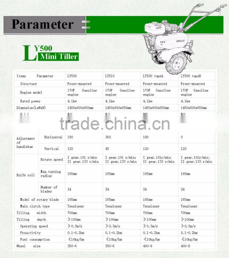 LY 500 series mini tiller are used to prepare soil in small areas or small farm field, such as flower beds or small gardens. Many of the smaller cultivators are self-propelled for ease of use.