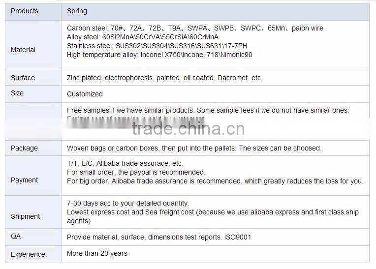 We can provide all kinds of other springs, such as compression springs, tension springs, disc springs, torsion springs, wire forms, clock springs, constant force springs, die springs, motor springs, wave springs, medical springs, spring rings, leaf springs, etc. Follows are some details for our springs.