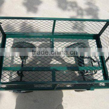 The TC1840A garden wagon cart is made of steel with four 10" ×3.50-4 pneumatic wheels. With strong structure this garden wagon is capable of transporting 550lbs, good for yard and landscaping projects. It has mesh sides that can be locked or folded for easy storage, its heavy-gauge mesh bed warranty long-lasting use and it's easy to clean.