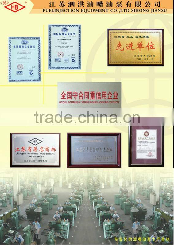 Jiangsu Sihong Fuel Injection Equipment Co., Ltd. is a professional factory of "HB" brand diesel engine oil systems, the assembling of nozzles, plungers and valves, and three pair precise parts. Our company has 42 years' history, and occupies an area of about 110,000 square meters, including construction area of about 58,000 square meters. We have totally 2,000 workers, including 386 engineers. We have advanced equipment, craft, full testing machine, very strong technical force, and modernization management. Also we have big lots, more types, and high quality production scale. In the year 2002, we built up the company ERF, CAD, OA, CAM information control system, controlling all the function departments. In the same year, "HB" brand was appraised as Jiangsu Famous Brand. In the year 2003, our company passed ISO14001:1996 system and ISO9001:2000 quality system. "HB" five series, totally 400 types of famous machines, parts of cars, and projected machines all are produced by using ISO and overseas advanced system. We have the strict quality control system in the full production procedure. All the products are suitable for single crock diesel engines and multi-diesel engines. Our company enjoys good sales in 31 provinces in China. Our products are exported to Burma, Thailand, Singapore, Bengal, Pakistan, and Vietnam. They are very popular there. We welcome all the customers. And will give you the best price, best quality and best service.