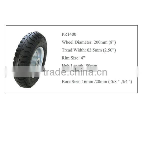 Pneumatic rubber wheel: 6x1.5, 8x2.50-4, 2.50-6, 9x3.50-4, 10x3.00-4, 10x3.50-4, 11x4.00-4, 12x3.50-6, 13x4.00-6, 14x3.50-8, 16x4.00-8, 13x5.00-6, 15x6.00-6, 16x6.50-8, 18x8.50-8 and other sizes according to your requirements.