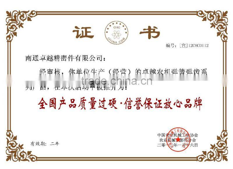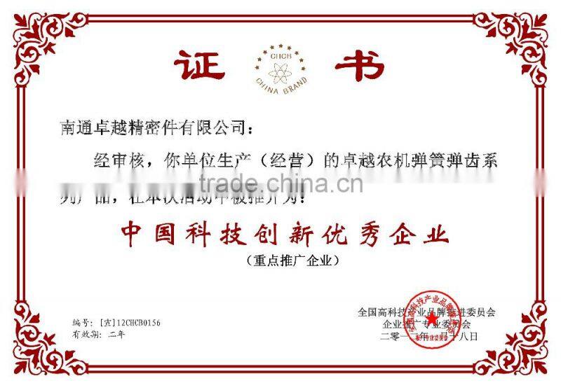 Nantong Zhuoyue Accurate Fittings Co., Ltd, established in 2002, is a modern trading company,we have our own factory! specializing in the research, design, manufacture, sale and service of springs & spring fittings. The company has fixed assets of 50 million RMB and covers an area of about 15,000 square meters. At present, we have about 38 employees, including 8 technical personnel, 12 management personnel, marketing personnel. There are more than 80 sets of production & test equipments, including computerized coiling machine, wire forming system, hot coiled spring line, computer 8-model machine, automatic quenching & annealing line, automatic grounding machine and shot peening machine. With the most advanced spring production equipments, we can manufacture different kinds of springs with diameter from 0.1mm to 80.0mm. Our daily output is about 40 million pieces. Our products include compression springs, extension springs, torsion springs, belleville springs, spiral springs, wave springs, disc springs, wire form springs, punching components, stainless steel springs and so on. Spring hardware products are widely used in transportation accessories, agricultural equipments, elevator accessories, sports fitness equipments and other industries. Agricultural machinery parts springs are one of our main products, such as the baler machine spring tooth, hay rake machine spring-tooth, rubber spring tooth, harvesting machinery springs, spring-tooth hard machinery, etc. In 2007, the company passed the ISO9001:2000. We have won a good reputation from customers relying on good quality, considerate service and competitive prices. Sincerely hope that we could have the chance to work with you in the near future, and create a brighter future together with you !