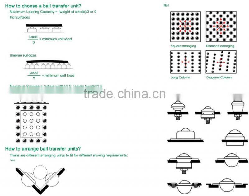 2)Typically the design involves a single large ball supported by smaller ball bearings.They are commonly used in an inverted ball up position where objects are quickly moved across an array of units, known as a ball transfer table, a type of conveyor system. This permits manual transfer to and from machines and between different sections of another conveyor system.