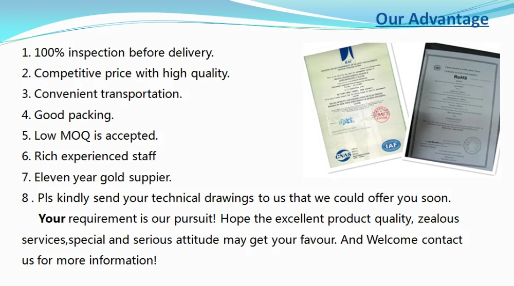We have passed to hold ISO9001 certificate and all of our products fully comply with RoHS.