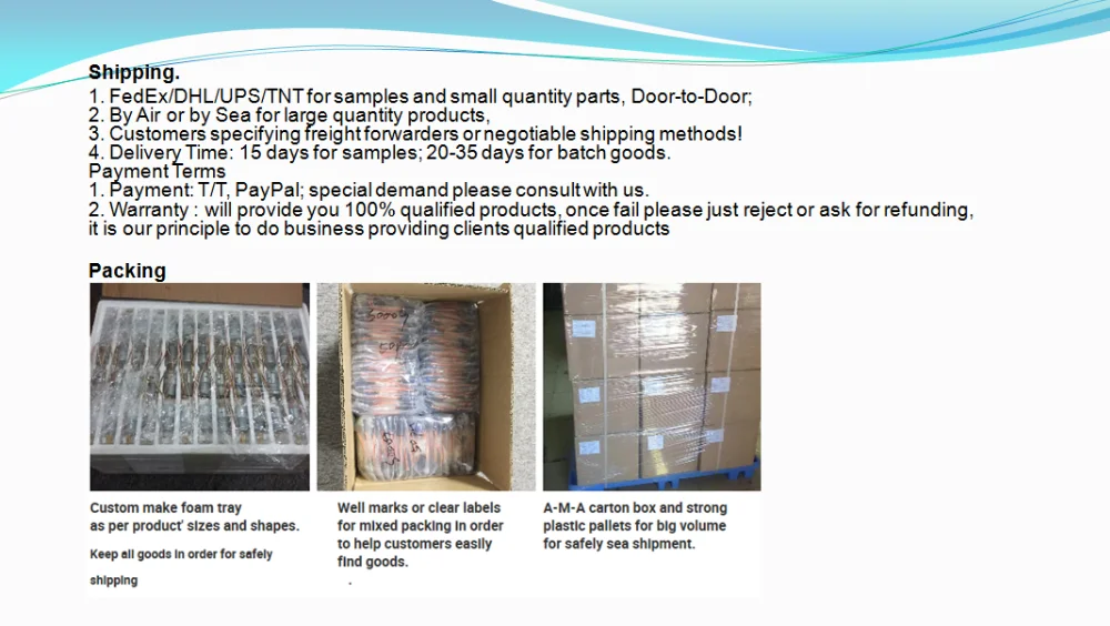 or you can provide us your dhl, ups, fedex or tnt acount to us for samples' shipment.