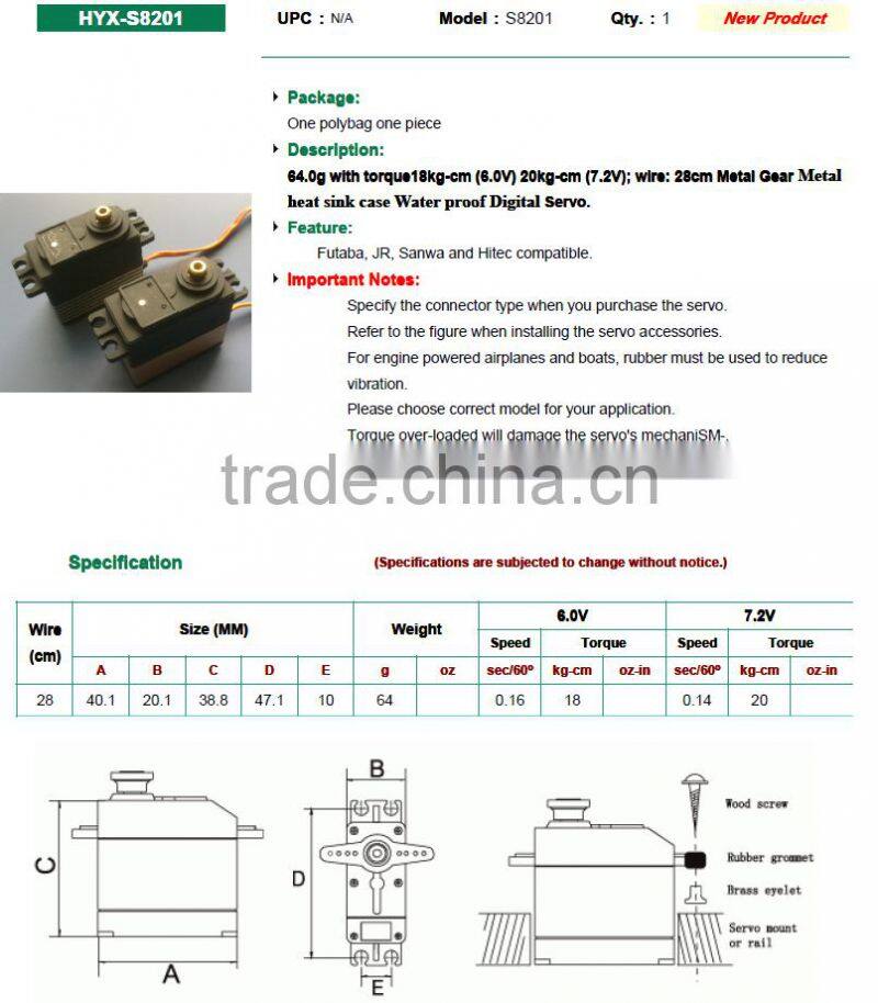 1. High end high torque servo motor with 50 gram weight , torque 18 kg-cm @4.8V , 20kg-cm @ 6v, 30 cm long cable