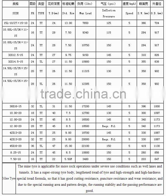 The mine tyre is applicable for more rock operations under severe use conditions such as well lanes and tunnels. It has a super-strong tyre body, lengthened tread of tyre and high-strength and high-hardness special tread formula, so that it has good cutting resistance, puncture resistance and wear resistance; and due to the special running area and pattern design, the running stability and the passing performance are good.