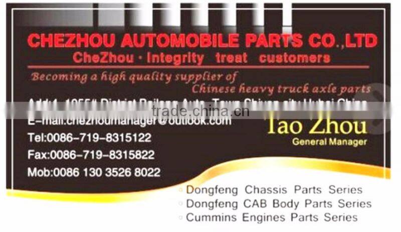 Chezhou Auto Parts Co., Ltd. is a professional parts supplier, which located at the foot of the mount Wudang in Shiyan with the most Dongfeng truck in China. And here is world-famous capital of car , the traffic is convenient and scenery is beautiful; it only takes 3 hours to reach Wuhan Port. We provide long-term supply for original and high quality parts for Dongfeng Kinland, Dong feng T- lift, and all other auto truck which can be also delivered according to OEM number.