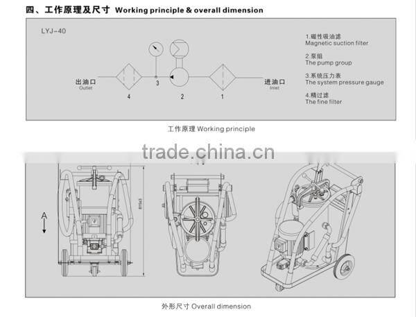 LYJ-40 filter cart is a new generation oil purification equipment developed by us.This machine is easy to operate and reliable to use. It is suitable for hydraulic system of various industries,lubrication system,cooling system,static pressure system media(a variety of hydraulic oil, lubricating oil, cooling liquid)filtration, purification, and can also be used for refueling or low pressure line system cleaning.