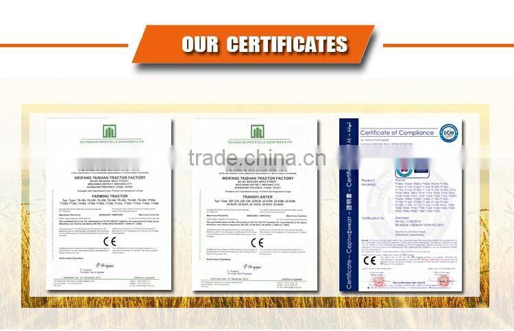 The ‘WEITAI’ branded agricultural machinery and equipment have passed CCC Quality Authentication and Chinese ministry technical appraisal. Moreover, Weifang Taishan Tractor Factory has been awarded the honors of ‘International Blue-sky Golden Prize’ and ‘The Appointed Factory of Special Used Fine Products’. Tractor and rice transplanter products have generated the CE certification.