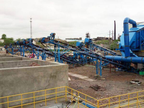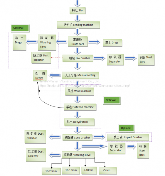 The raw material of the construction waste is crushed through the feeder into the crusher, and the material after the crushing is sent by the belt (the iron is transported at the same time as the belt conveyor). The sieving station is sieved through the screening station. Four materials are 0-5mm, 5-10mm, 10-15mm,> 15mm(According to customer needs can change),Which 10-15mm, >15mm material in the material before the light material handling,> 31.5mm of the material from the new break into the closed loop.