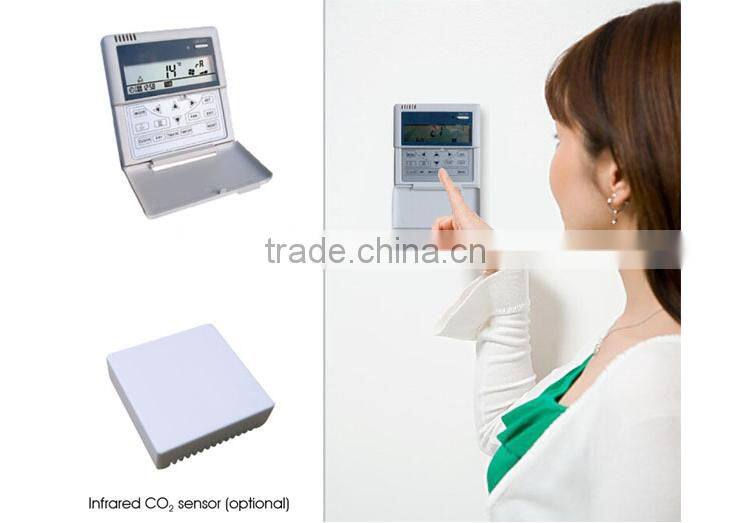 1)Airflow rate switch (10 speeds) 2)Temperature display 3)Automatic bypass 4)Weekly timer 5)Data memory/power to restart 6)Automatic defrosting 7)Electric heater defrosting (optional) 8)Comfortable heating (optional) 9)External ON/OFF (optional) 10)CO2 concentration control (optional) 11)BMS integration (optional) 12)Working condition monitor (optional)