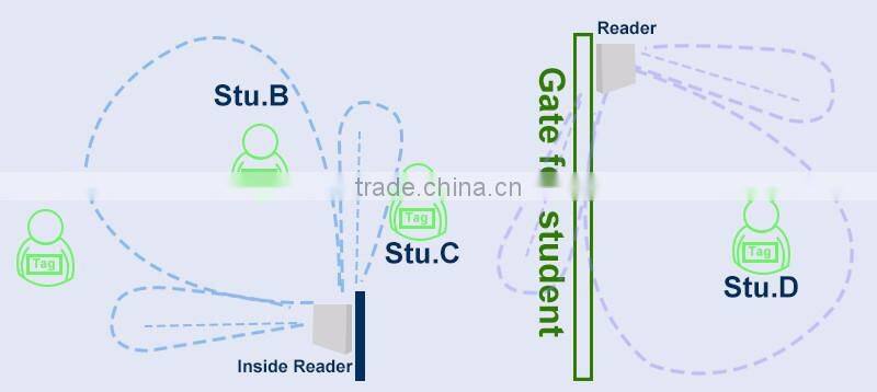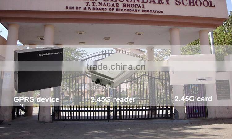 Install two 2.45G reader at school gate, one at front side,one at back side, both reader need connect with one GPRS information machine, every students take one 2.45G card (can take on hand,hang on neck or put inside bag),when they walk close to the gate,their card will be read, the students information will transfer to system through GPRS information machine, the machine can insert Sim card, when system receive data,the sim card also will send SMS to parents, they can know they children arrive school time and leave school time.