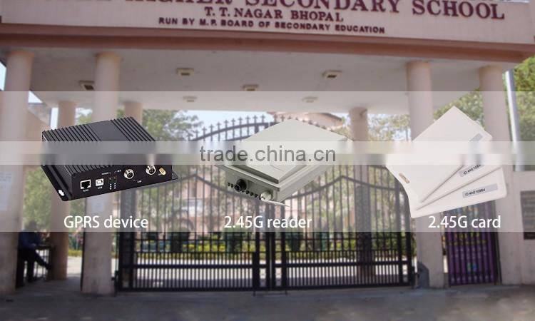 Install two 2.45G reader at school gate, one at front side,one at back side, both reader need connect with one GPRS information machine, every students take one 2.45G card (can take on hand,hang on neck or put inside bag),when they walk close to the gate,their card will be read, the students information will transfer to system through GPRS information machine, the machine can insert Sim card, when system receive data,the sim card also will send SMS to parents, they can know they children arrive school time and leave school time.