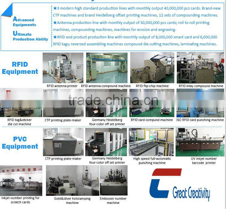 1) Ultimate production ability. We have three latest production lines, importing two sets of German Heidelberg four color off-set printing machines, and one set two color printing machine, one set one color printing machine, automatic six color and four color silk-screen printers, card cutting machine, and laminating machines. At present, our production capacity is 40 million pieces monthly, with efficient production, punctual lead time, and fast delivery.