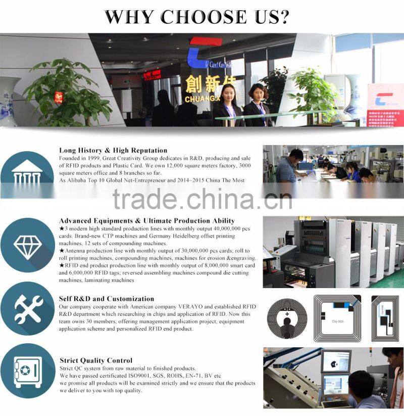 Founded in 1999, Great Creativity Group dedicates in R&D, producing and sale of RFID products and Plastic Card like RFID tag, RFID smart card, RFID wristband, RFID blocking products, Plastic card, Plastic luggage tag etc.