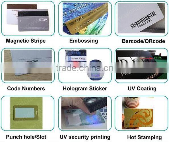 Available crafts | 4 color offset printing, embossing number, signature panel, photo, barcode, thermal printing, gold/silver hot stamp, scratch-off, series number, hole punched, UV printing etc. |