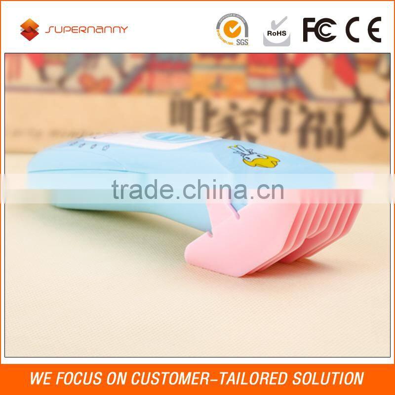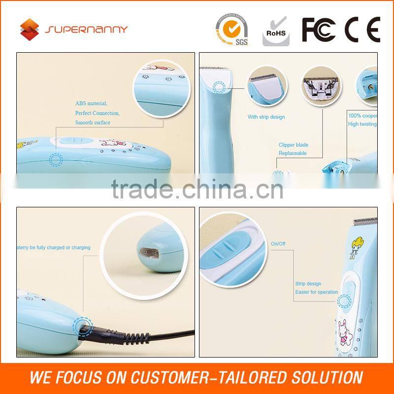 Our Supernanny baby hair clippers are specially designed for the kids. It's very popular among parents for its cute appearance, excellent quality and safe operation. And the ceramic and stainless steel blade protects baby skin, making the baby no fear to the hair cut. With low vibration design, it’ll not wake up baby. For easy-operating hair clipper with 2 attachment combs, you will never feel tired of shaving but a pleasure, you can easily give your little sweetie a cute hair style, and after a long time, you will become a professional hair cutter.