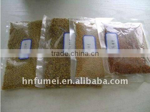 The multi-flower bee pollen granular commonly consists of different kinds of bee pollen such as rape, buckwheat, Indian corn, sunflower, tea pollen etc. Different pollen has different color, for example, the rape pollen is light yellow, the buckwheat pollen is brown, the tea pollen is orange, etc. The distribution of each kind in the multi-flower bee pollen is naturally formed and unstable.
