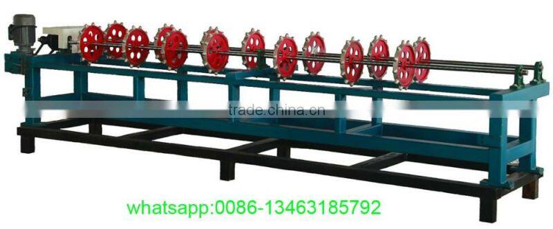 Chain link machine for manufacturing chain link fences of different sizes. The wire is taken in from the payoff stand and passed through the dies where the DIAMOND SIZE takes place. Different gap sizes. After passing from the die the diamond pattern wire is automatically thrown on the winding shaft in the stitching process. Once the stitching is complete the woven is manually glided down to enable the next stitch to take place.