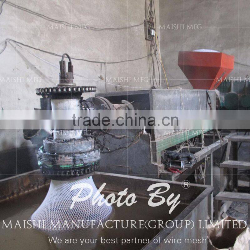 HDPE mesh also called Plastic breeding net.The plastic material is heated and then melted in extrusion machine, flowing into special rotating head with a lot of holes. Melted plastic flow through holes forming two melted plastic wire then merged together by roating the head or the machine. Finally cooled into net, into final hdpe mesh.