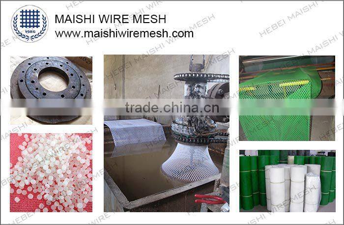 MAISHI Extruded plastic mesh (aka plastic breeding net) is heated molten plastic material in the extruder, the screw extruder has entered a number of small holes inside and outside special rotating die head, molten plastic flows through the die pore the formation of two shares melt wire, because the head rotation, two stocks converge at one point interrupted silk material, thereby forming a network, and then cooling stereotypes into the net.