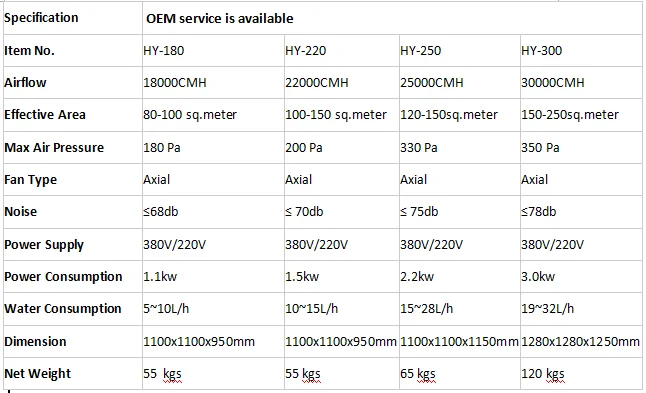 1) airflow: 18000 m³/h2) power :380V/50HZ CUSTOMIZED3) water consumption:11 L/h