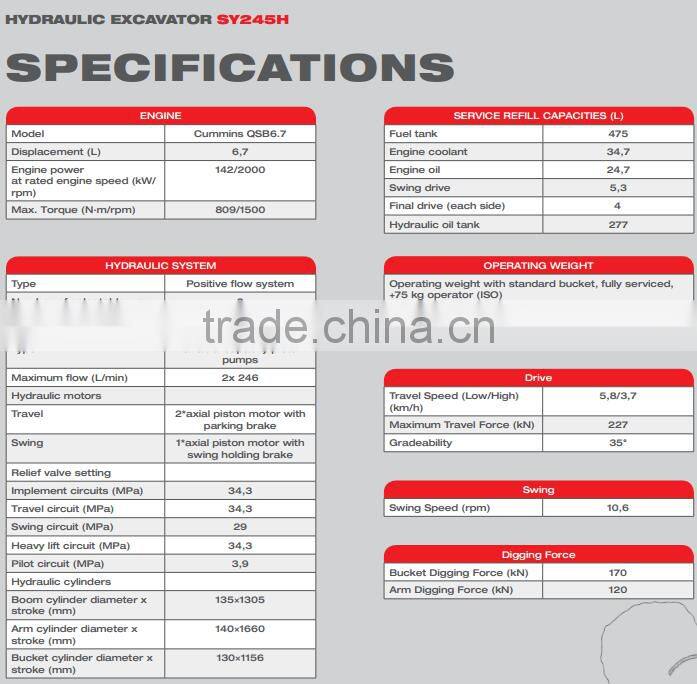 SY245 24.5 ton excavator are designed with reinforced structure, high efficiency, high fuel efficiency and low environmental impact and maintenance costs, suitable for medium-sized earthwork.