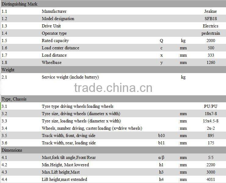 High Quality CE/ISO approved 1.8T Three Wheel electric stacker stand drive JEAKUE SFB18