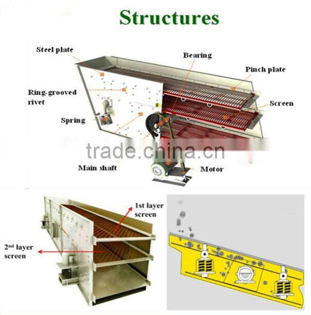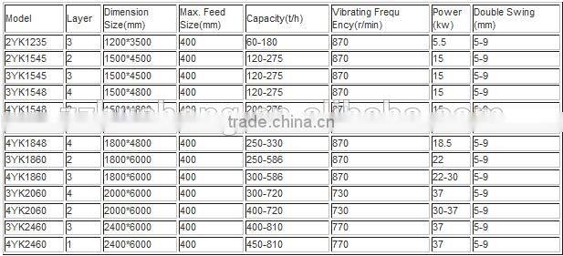 Vibrating screen uses electric exciter as vibrating source, the material will be thrown around the screen, at the same time doing forward sports, in order to achieve the screening purpose. Material from the feeder evenly enters into the machine's feeding inlet, with multilayer sieves to produce various of products and unqualified products on the screen or under the screen, then discharging from the outlet repectively. It can be used in the automatic production line.