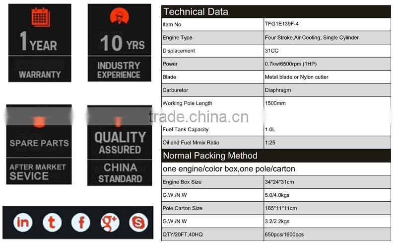 4 stroke brush cutter china and power grass trimmer with 139F engine