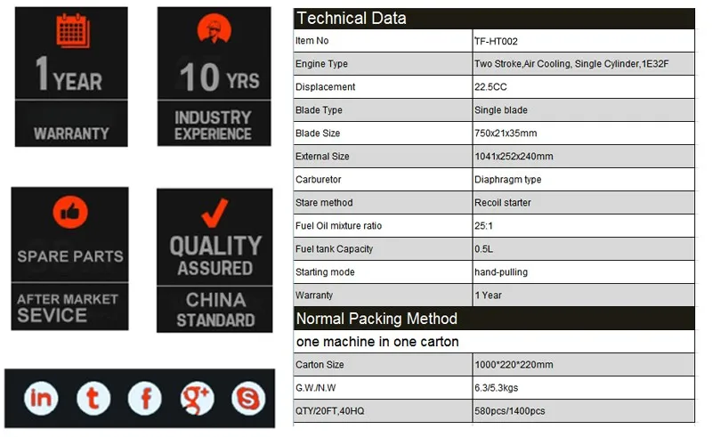 Professional hedge trimmer machine 22.5cc gasoline powered engine with single blade(TF-HT002)