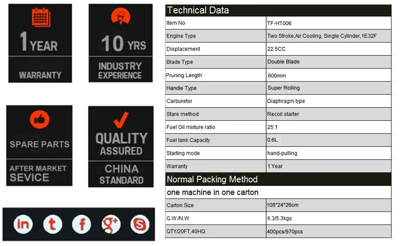 | Model Number | TF-HT006 | Power Source | Gasoline Hedge Trimmers | |