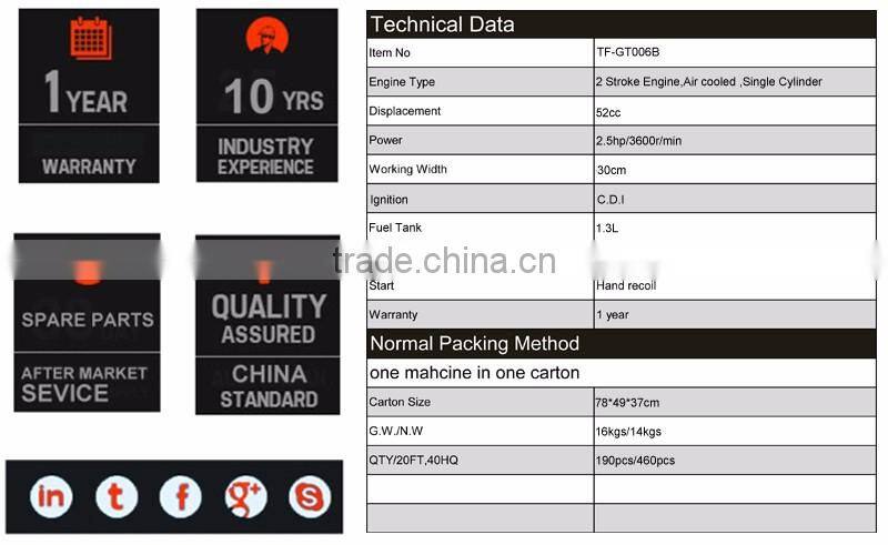 TAFUN makes different ranges of Brush cutter to help make life much easier for trimming grass in your garden , also we have different types of trimmer for different area. side attached ,backpack,hand push types brush cutters for options