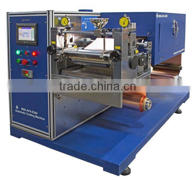 MSK-AFA-E300-UL is a CE Certified and UL inspection ready automatic battery electrode coating system with a compact footprint that is less than 6'x3'. It is perfect for research or building prototypes (e.g. pilot scale studies) of new generation rechargeable batteries. It is integrated with the functions/ features of metallic foil roll unwinding (reeling out), slurry feeder, coating blade, baking oven, and final electrode winding (reeling in) together with touch screen operation for customer's utmost convenience.