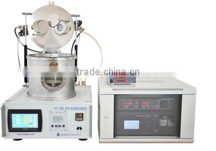 VTC-600-2HD is a magnetron sputtering system featuring dual target sources: 1) DC source for coating metallic material on one head and 2) RF source for coating non-metallic material on the other head. It is equipped with a film thickness tracker to enable the user to easily monitor the coating progress and also record the data.