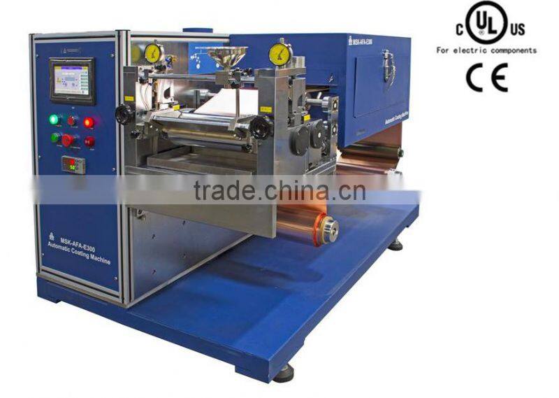 MSK-AFA-E300-UL is a CE Certified and UL inspection ready automatic battery electrode coating system with a compact footprint that is less than 6'x3'. It is perfect for research or building prototypes (e.g. pilot scale studies) of new generation rechargeable batteries. It is integrated with the functions/ features of metallic foil roll unwinding (reeling out), slurry feeder, coating blade, baking oven, and final electrode winding (reeling in) together with touch screen operation for customer's utmost convenience.