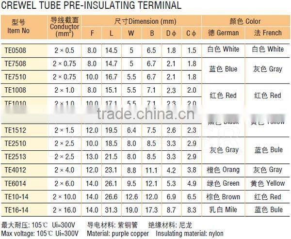 Crewel Tube Pre-Insulating TE series Terminal Lug Sizes