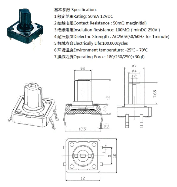 KFC-012-12J 4pin 12MM PCB Type Tact Switch,KFC 12*12*12 Tact Switch#