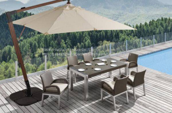 HaoMei leisure outdoor furniture series main product includes many types of PE rattan weave items, stainless steel items, aluminum or steel mesh items, wooden items, textilene fabric items, such as table chair set, sofa set, bar table set, chaise lounge, daybed, swing, and outdoor umbrella. HaoMei furniture elegance model, fashion, beautiful, unique Eurofins amorous feelings, the combination of art and taste, is the first choice for fashionable hotel, club, restaurant, villa and others outdoor and indoor auxiliary product.