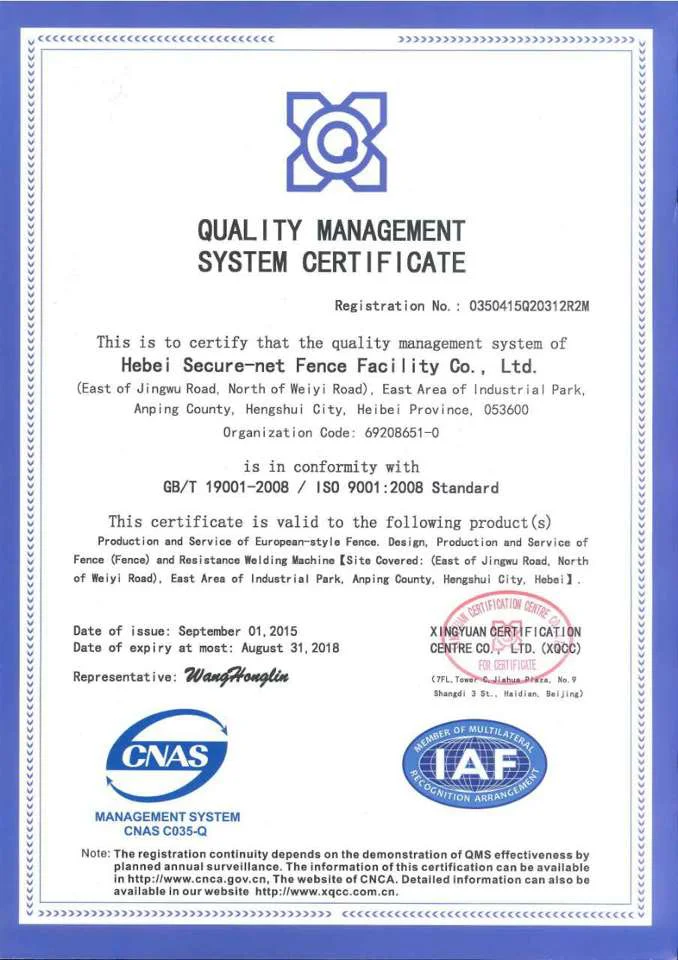 In 2002 the company passed the ISO9001 quality management system certification; 2004 was awarded the project to build advanced units, excellent credit enterprises, scientific and technological progress advanced units; the end of 2006 the company has made the right to export; May 10, 2006 SECURE NET fence to get State Intellectual Property Office issued a patent certificate