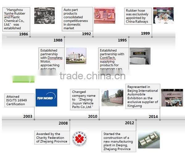 Zhejiang Jiuyun Vehicle Parts Co., Ltd(Hanghzou Yunhe Rubber Plastic & Chemicals Co.,Ltd) is professional manufacture specialized in vehicle rubber products.With a history more than two decades,JIUYUN mainly supply various kinds of silicone and rubber hoses and accessories for China machinery OEMs and large manufactures.