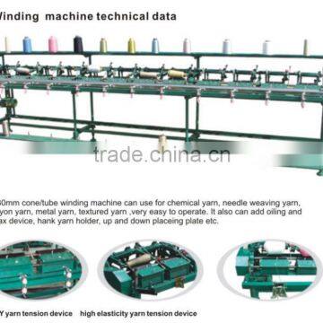 230mm cone /tube winding machine can use for chemical yarn, needle weaving yarn, rayon yarn, metal yarn, textured yarn, very easy to operate. It also can add oiling and wax device, hank yarn holder, up and down placing plate etc.