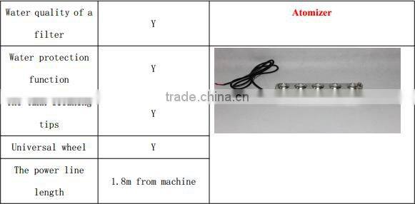 1. Internal adopting integrated type ultrasound machine, no mechanical drive, no noise, producing certain negativeion and low failure rate and easy maintenance, the output fog grain diameter only be 1- 10 μ. The stainless steel body, powder coated, beautiful appearance, standard filling water mouth, switch andoutlet water spill, including nozzle to be automatic filling water, automatic control water level;