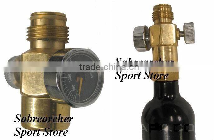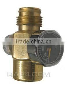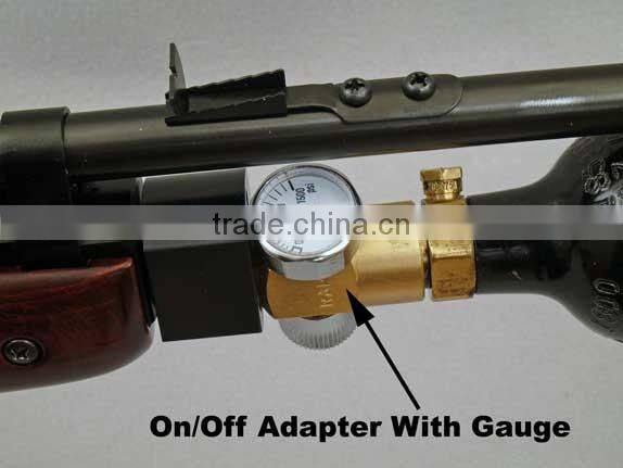Simple on-off valve adapter that allows you to turn on/off your tank with a quick turn. This adapter also has a pressure gauge which allows you the ability to know how much pressure is left in your tank. Gauge displays 0-1500psi reading.