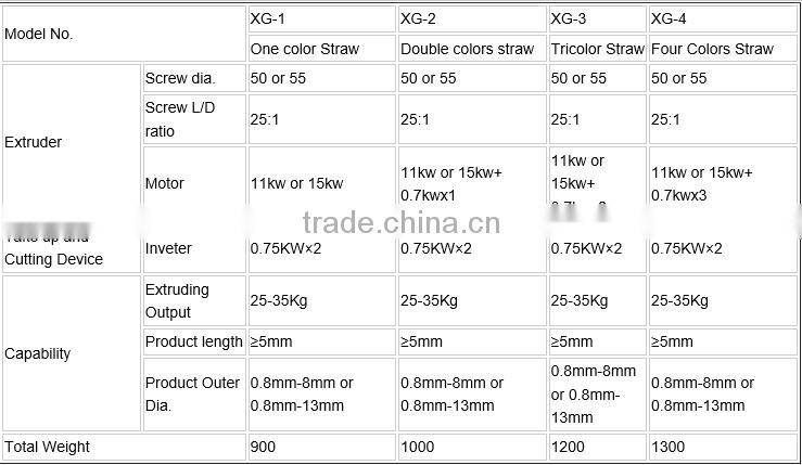 The series Drink straw making machine are composed of frequency extruding system,tooling,cooling sink or vacuum cooling sink,drawing and cutting devices etc.It has such features sa reasonable structre and steady operation,each part are all fine finshed,There are single-color,double,double-color,tri-color and four-color drink straw makers,which all can produce the various colors straws with the diameter from 1to 14mm.